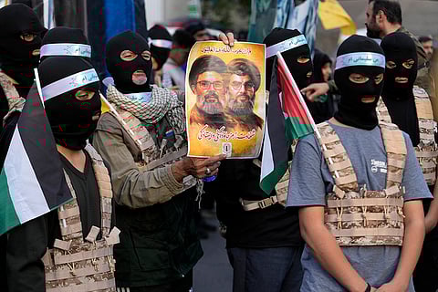 A group of the Iranian demonstrators cover their faces in the Palestinian and Lebanese militants style as one of them holds a poster of slain Hezbollah leader Hassan Narallah, right, and Hashem Safieddine, a powerful cleric who was expected to succeed Nasrallah and was killed by an Israeli airstrike in Beirut, in a ceremony commemorating the late Hamas leader Yahya Sinwar and Hashem Safieddine, at the Felestin (Palestine) Sq. in Tehran, Iran.