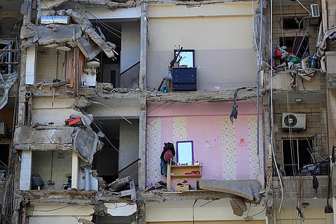Damaged furnitures left on destroyed apartments that were hit by Israeli airstrikes, in Tyre, south Lebanon.