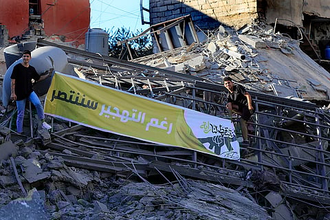 Hezbollah supporters stand on the rubble of a destroyed building hit by Israeli airstrikes, as they hold an Arabic banner that reads: "Despite the displacement we will be victorious", in Tyre, south Lebanon.