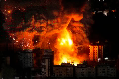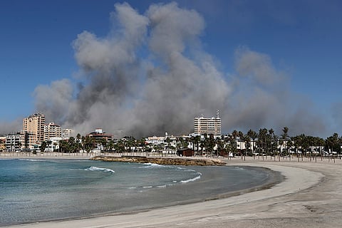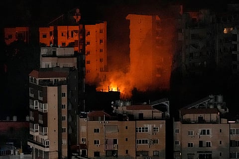 Flame rise from a past Israeli airstrike on Dahiyeh, in the southern suburb of Beirut, Lebanon.