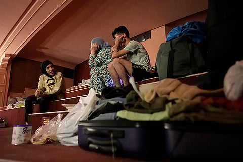 Mona Hanafi, center, who fled the ongoing Hezbollah-Israel war in south Lebanon, sits with her family, inside one of Beirut's oldest and best known movie theatres, Le Colisee, in Beirut, Lebanon.