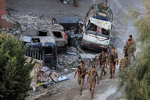 Lebanese army soldiers walk by destroyed cars at the site where an Israeli airstrike hit a building, in Barja village, south of Beirut, Lebanon.