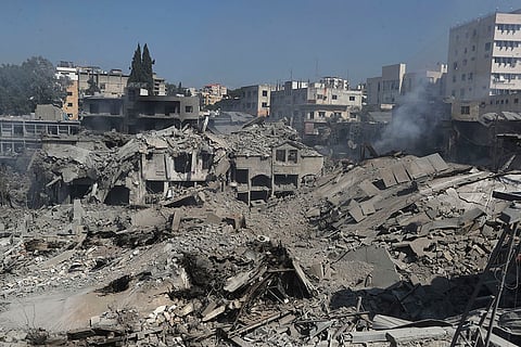Hezbollah rescue workers search for victims amid the rubble of destroyed buildings at commercial street that was hit Saturday night by Israeli airstrikes, in Nabatiyeh town, south Lebanon.