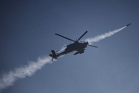 An Israeli Apache helicopter fires a missile towards southern Lebanon as seen from northern Israel.