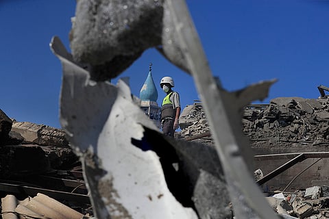 A Hezbollah rescue worker stands on the rubble of destroyed buildings at commercial street that was hit Saturday night by Israeli airstrikes, in NAbatiyeh town, south Lebanon.
