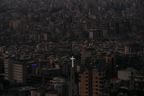 The cross atop of Our Lady of Hadath Church appears in front of Beirut's Dahiyeh suburb, background, that remains in darkness after Israeli airstrikes, Lebanon.