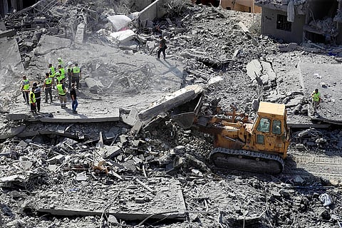 Rescue workers use a bulldozer to remove rubble of destroyed buildings, as they search for victims at the site that was hit by Israeli airstrikes in Qana village, south Lebanon.