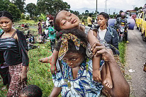 A mother carries household items while her baby sleeps as she approaches the city of Goma, joining others fleeing the intense conflict in Masisi territory. The exodus is fuelled by the escalating violence imposed by the M23 rebel group in Nord-Kivu