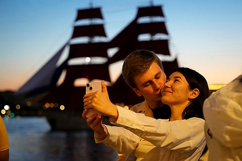 A couple take a selfie photo with a brig with scarlet sails floating on the Neva River during a rehearsal for the Scarlet Sails festivities marking school graduation in St. Petersburg, Russia.