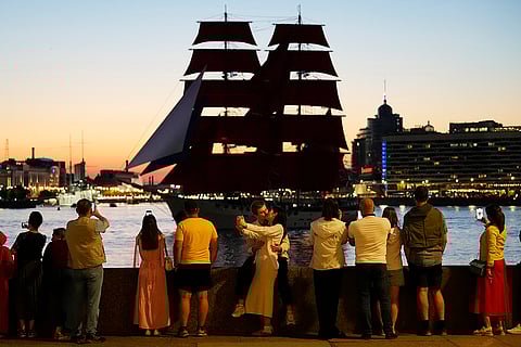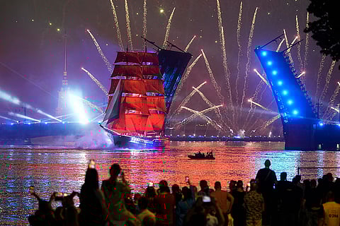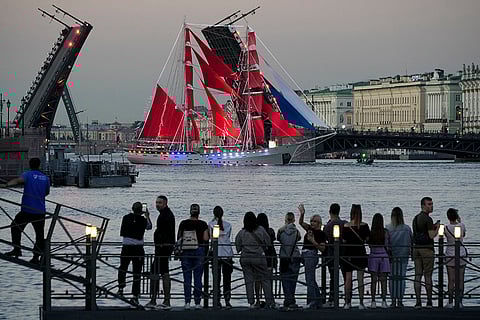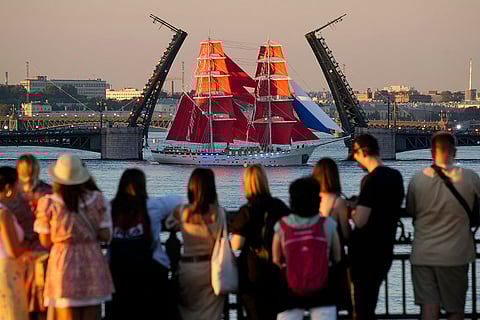 People look at a brig with scarlet sails floating through Dvortsovy (Palace) drawbridge on the Neva River during the Scarlet Sails festivities marking school graduation in St. Petersburg, Russia.
