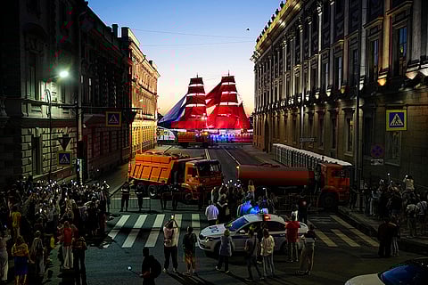 A brig with scarlet sails floats on the Neva River as the police block the way for people to the embankment during a rehearsal for the Scarlet Sails festivities marking school graduation in St. Petersburg, Russia.