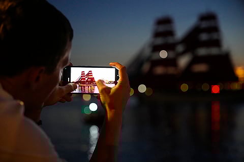 A man takes a video of a brig with scarlet sails floating on the Neva River during a rehearsal for the Scarlet Sails festivities marking school graduation in St. Petersburg, Russia.