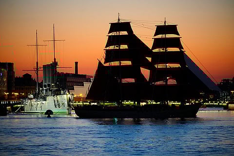A brig with scarlet sails floats on the Neva River past the Aurora Cruiser which gun fired a blank shot giving the signal to begin the Bolshevik Revolution in 1917, during a rehearsal for the Scarlet Sails festivities marking school graduation in St. Petersburg, Russia.