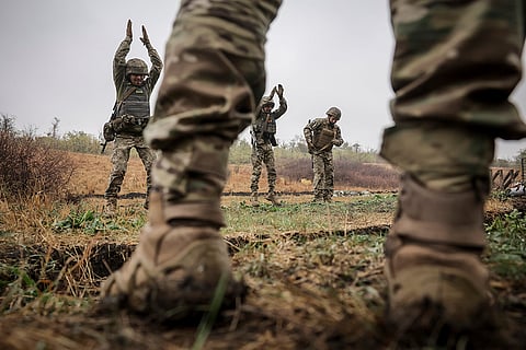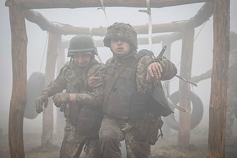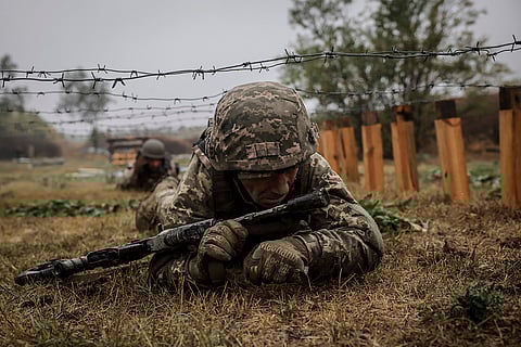 In this photo provided by the 24th Mechanised brigade press service, Ukrainian Newly recruited servicemen improve their tactical skills on obstacle course at the training field in Donetsk region, Ukraine.