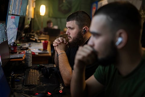 Ukrainian servicemen of Khartia brigade control the drone aerial view in the command centre in Kharkiv region, Ukraine.