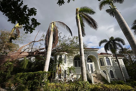 A tree toppled by Hurricane Milton lies atop a stately home in Siesta Key, Florida.