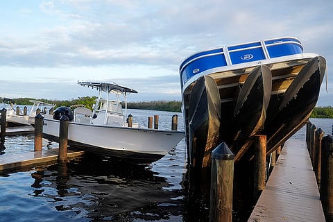 Small boats rests on a pier after they were unmoored during Hurricane Milton in Fort Myers, Florida.