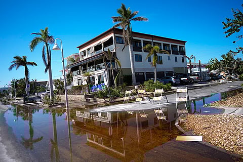 Rain flood waters recede around the bay-front home which Christian Burke's father had built to be hurricane proof and where Burke rode out Hurricane Milton along with his wife and aunt, in Gulfport, Florida.