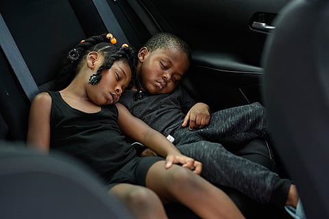 Siblings Saboria, 4, left, and Messiah Tyler, 3, nap in the backseat of a car after the roof was torn off the home where they lived with their mom, grandparents, an aunt and an uncle during the passage of Hurricane Milton, in Palmetto, Florida. The family of 7 rode out the storm in a government shelter, and returned home to find most of the roof gone and their furniture and belongings destroyed by rainwater.