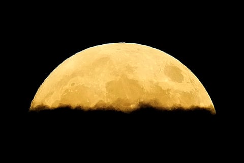 A supermoon rises behind clouds over Larnaca international airport in the eastern Mediterranean island of Cyprus.