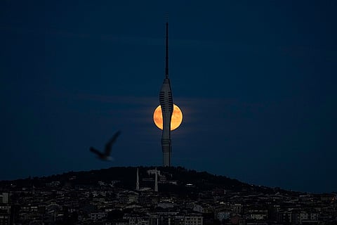 A supermoon rises behind Camlica tower in Istanbul, Turkey.
