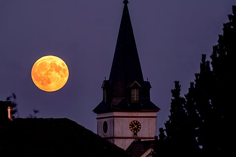 The full Harvest moon rises behind the church in Wehrheim near Frankfurt, Germany.