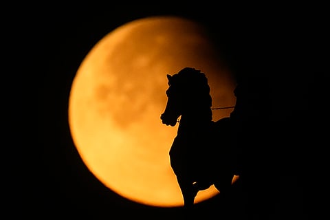 A supermoon rises behind a horse statue atop of Triumphal Arc during a partial lunar eclipse in Moscow, Russia.