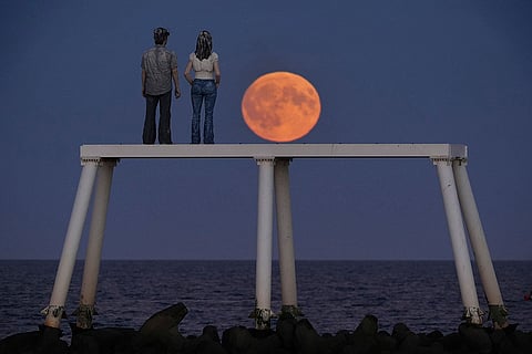 The Supermoon rises behind a giant idol of elephant-headed Hindu god Ganesha, in the Arabian Sea, marking the end of the 10-day long Ganesh Chaturthi festival in Mumbai.