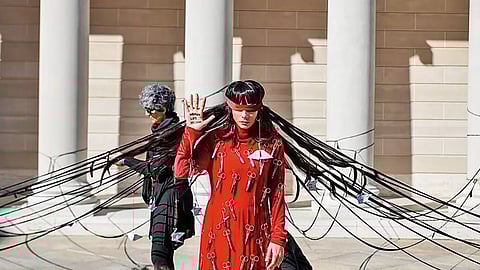 In January this year, Nouri wore a red dress draped in shiny scissors; eyes bandaged, and stood in the heart of San Francisco in the United States. She tied her flowing hair to the spires of a gate, each of the strands bearing the photograph of a protester imprisoned by the Iran government. She invited people to come and cut her hair. “It was to show solidarity for my sisters and raise awareness about the atrocities taking place in Iran,” she states.