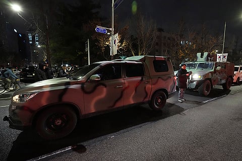 Military vehicles are seen outside of the National Assembly in Seoul, South Korea.
