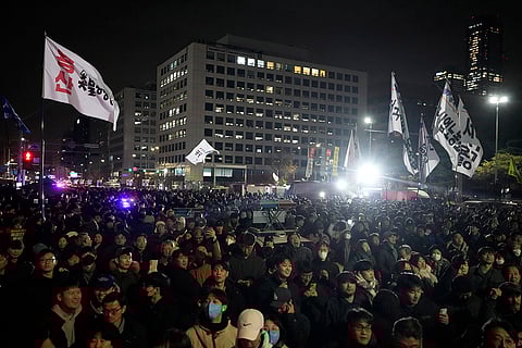 People gather to demand South Korean President Yoon Suk Yeol step down in front of the National Assembly in Seoul, South Korea.