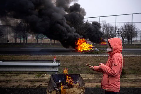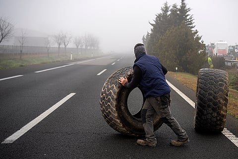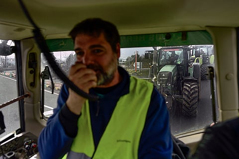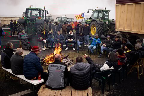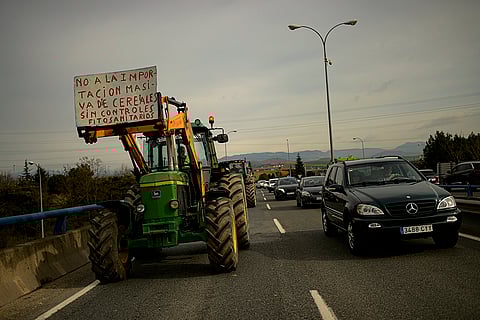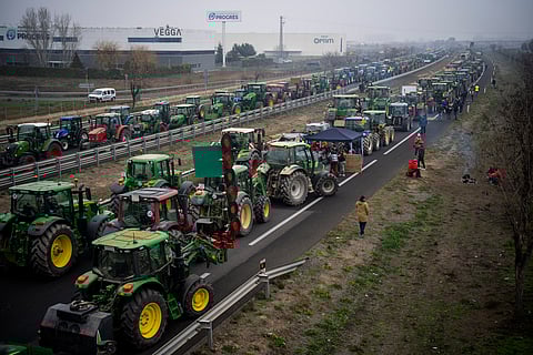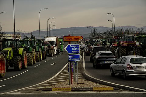 Tractors obstruct a roundabout in the center of the city while taking part in the massive protest, in Pamplona, northern Spain. From early morning, farmers across Spain have staged tractor protests across the country, blocking highways and causing traffic jams to demand of changes in European Union policies and funds and measures to combat production cost hikes.