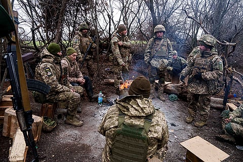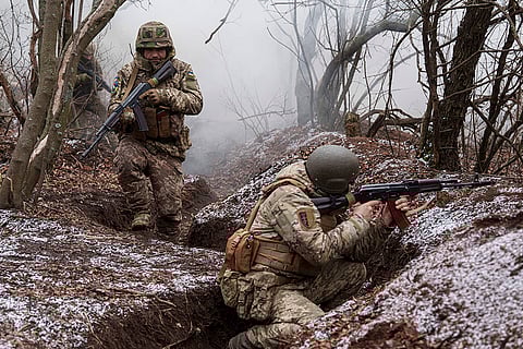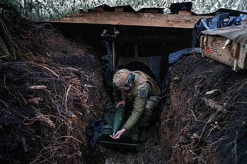 A Ukrainian serviceman of 14th National Guard "Chervona Kalyna" brigade prepares artillery shell before firing towards Russian positions at the frontline on Pokrovsk direction, Donetsk region, Ukraine.