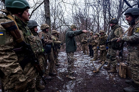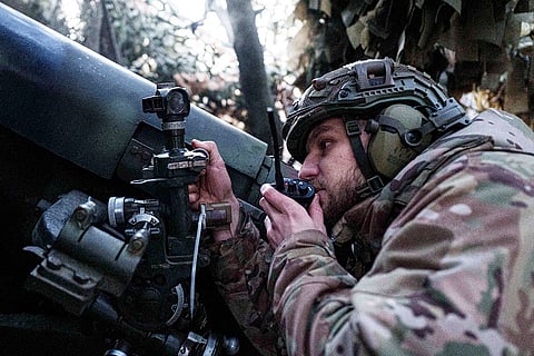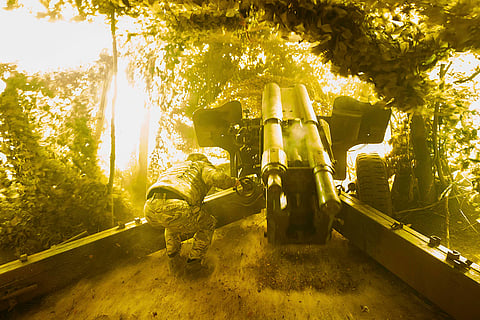 A Ukrainian serviceman of 14th National Guard "Chervona Kalyna" brigade aims his d-20 artillery cannon before firing towards Russian positions at the frontline on Pokrovsk direction, Donetsk region, Ukraine.