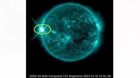 On December 31, 2023, at 4:55 p.m. EST, the Sun released a powerful solar flare. NASA's Solar Dynamics Observatory, which monitors the Sun continuously, recorded an image of this event.
