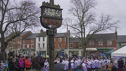 In the quaint English town of Olney, women adorned in matching checkered aprons, headscarves, and colorful running shoes gathered on Tuesday to partake in the time-honored pancake race, a tradition steeped in history and whimsy.
