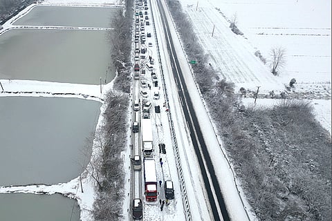 Vehicles are stranded on a snow covered expressway on the outskirts of Wuhan in central China's Hubei province. Widespread snowfall and freezing weather continued in central and eastern China disrupting transport and stranding travelers amid the annual Lunar New Year travel rush.