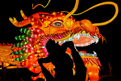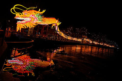 Women take a selfie with a giant dragon lantern decorated near the frozen Houhai Lake in Beijing. Chinese will celebrate Lunar New Year on Feb. 10 this year which marks the Year of the dragon on the Chinese zodiac.