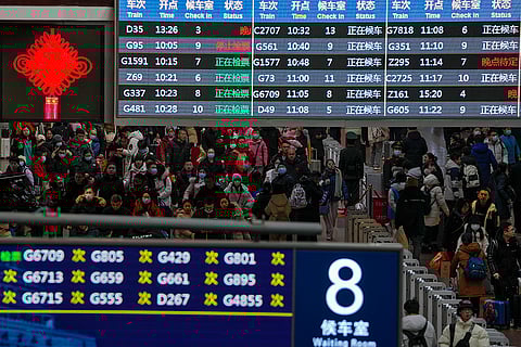 Travelers with their luggage walk beneath a trains departure board as they arrive at the West Railway Station to catch their trains, in Beijing. China's transport ministry estimates that about 9 billion trips are to be made during the lunar new year holiday travel rush period, with the peak days expected on Feb. 7 and 8. Transport stations are expected to be crowded as many Chinese travel to be with family during what is called the Spring Festival - the most cherished festival for family reunions in China.