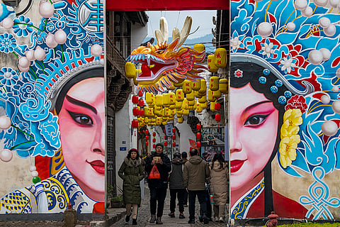 In this photo released by Xinhua News Agency, People tour the popular Poyang ancient street decorated with a dragon and lanterns in Jinhua, east China's Zhejiang Province.