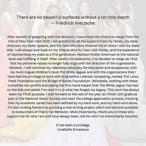 The pageant world was shaken to its core on Wednesday when Miss Teen USA, UmaSofia Srivastava, announced her resignation from her coveted title, sending shock waves through the pageant community. This announcement came just days after another significant resignation, that of Miss USA, Noelia Voigt, further intensifying the sense of upheaval within these prestigious competitions.