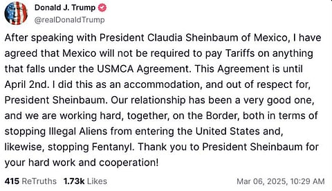 “After speaking with President Claudia Sheinbaum of Mexico, I have agreed that Mexico will not be required to pay Tariffs on anything that falls under the USMCA Agreement,” Trump posted on Truth Social.