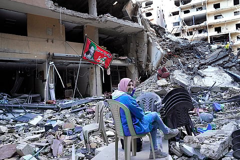A woman flashes the victory sign as she sits on the rubble of a building destroyed by an Israeli airstrike in Dahiyeh, in the southern suburb of Beirut, Lebanon.