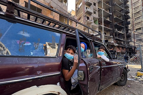 Children sit in a car as they wait their parents, who are collecting belongings from their house, which was destroyed by an Israeli airstrike in Dahiyeh, in the southern suburb of Beirut, Lebanon.