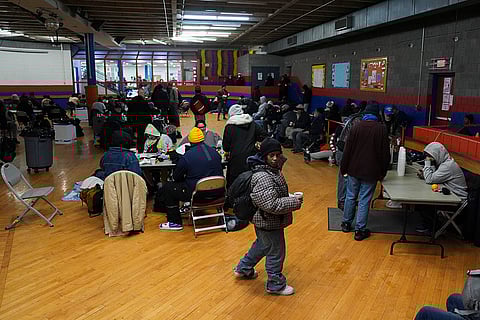 Patrons sit inside a daytime warming shelter in Cincinnati.