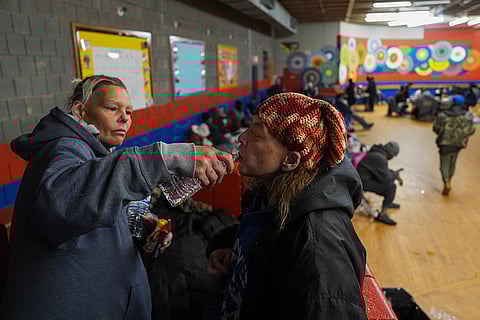 Harley Moody, right, who is blind, takes a sip of water, as Angel Rodda, left, holds it for her after they arrived inside a daytime warming shelter in Cincinnati.