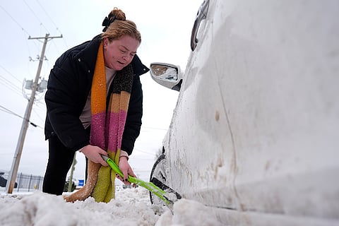 Taylor Mcilwain uses a snow brush to clear snow from around her car in Cincinnati.