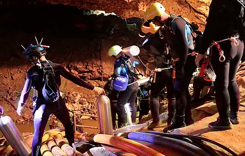 July 1: Rescue divers advance into the main passageway inside the flooded cave and set up a staging area inside. Thai navy SEALs reach a bend where the kilometer- (half-mile-) long passage splits in two directions.