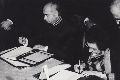 Indira Gandhi and Zulfikar Ali Bhutto sign the Shimla Agreement, 1972