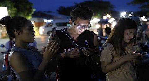 (People check their mobile phones for update while waiting at a military airbase during emergency helicopter evacuation in Chiang Rai province, AP Photo)